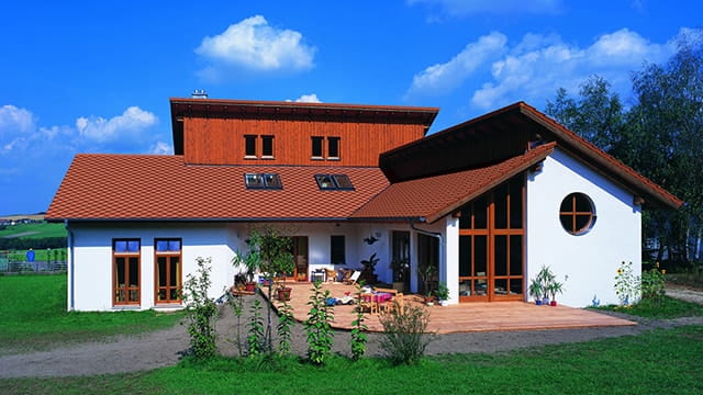 Традиционно сложившаяся в регионе форма крыши и используемый для нее материал идеально отвечают климатическим условиям. Многовековой опыт создает гармоничные и долговечные сочетания материалов и форм.