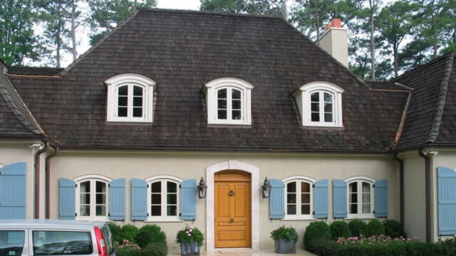 Рамы, ставни и двери обычно изготавливают из дерева, в идеале – состаренного. Все окна и двери имеют характерную мелкую расстекловку – она вполне официально называется «французской»! Исторически такая расстекловка обусловлена экономией – небольшое стеклышко проще и дешевле заменить – но сейчас она стала показателем стиля.