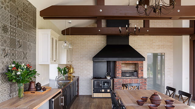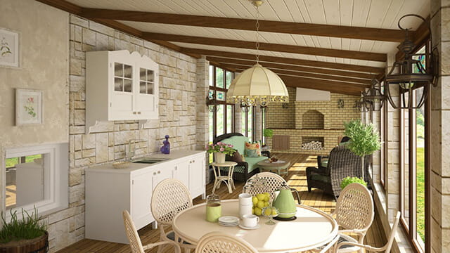 Предельная простота и натуральность – вот краеугольные камни этого стиля. Несущие балки на потолках не скрывают, а окрашивают в контрастный цвет, стены отделывают фактурной шероховатой штукатуркой, а иногда даже частично оставляют каменную или кирпичную кладку в необработанном виде. Для пола выбирают широкие толстые доски или же керамическую плитку природного терракотового оттенка.