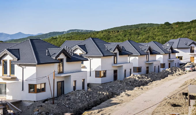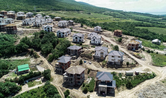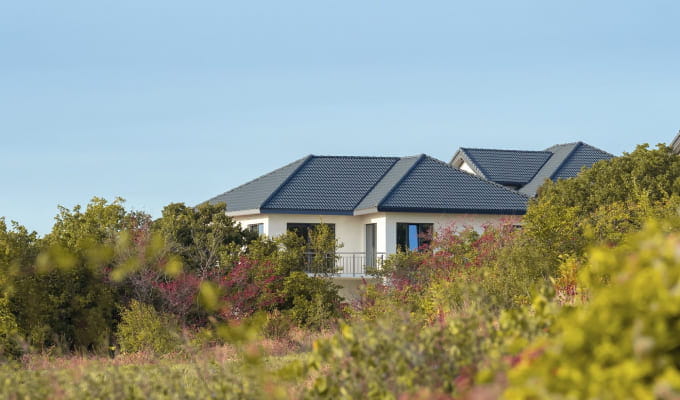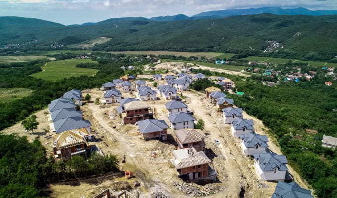 Строительство масштабного объекта началось в 2023 году, а его окончание запланировано на 2025 год. Общий объем застройки 55 коттеджей премиум класса, на кровлях применяют натуральную черепицу БРААС Таунус великолепного цвета Графит.