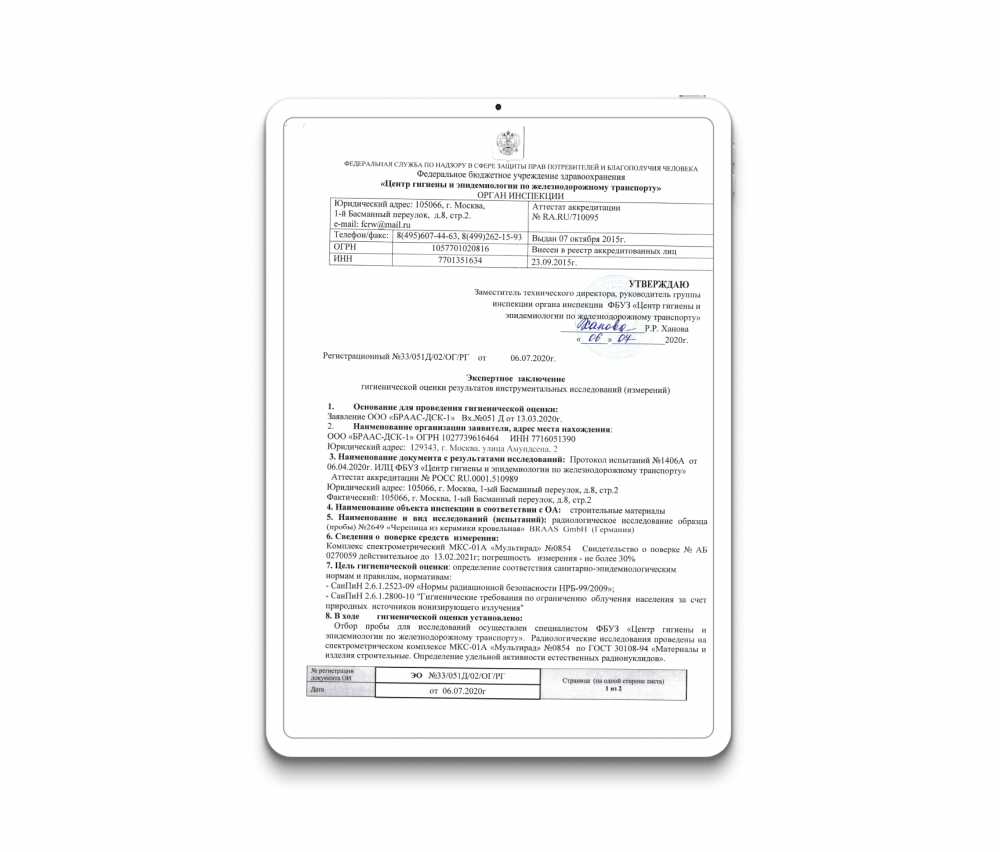 Протокол лабораторных радиологических испытаний минеральной (цементно-песчаной) черепицы БРААС Германия